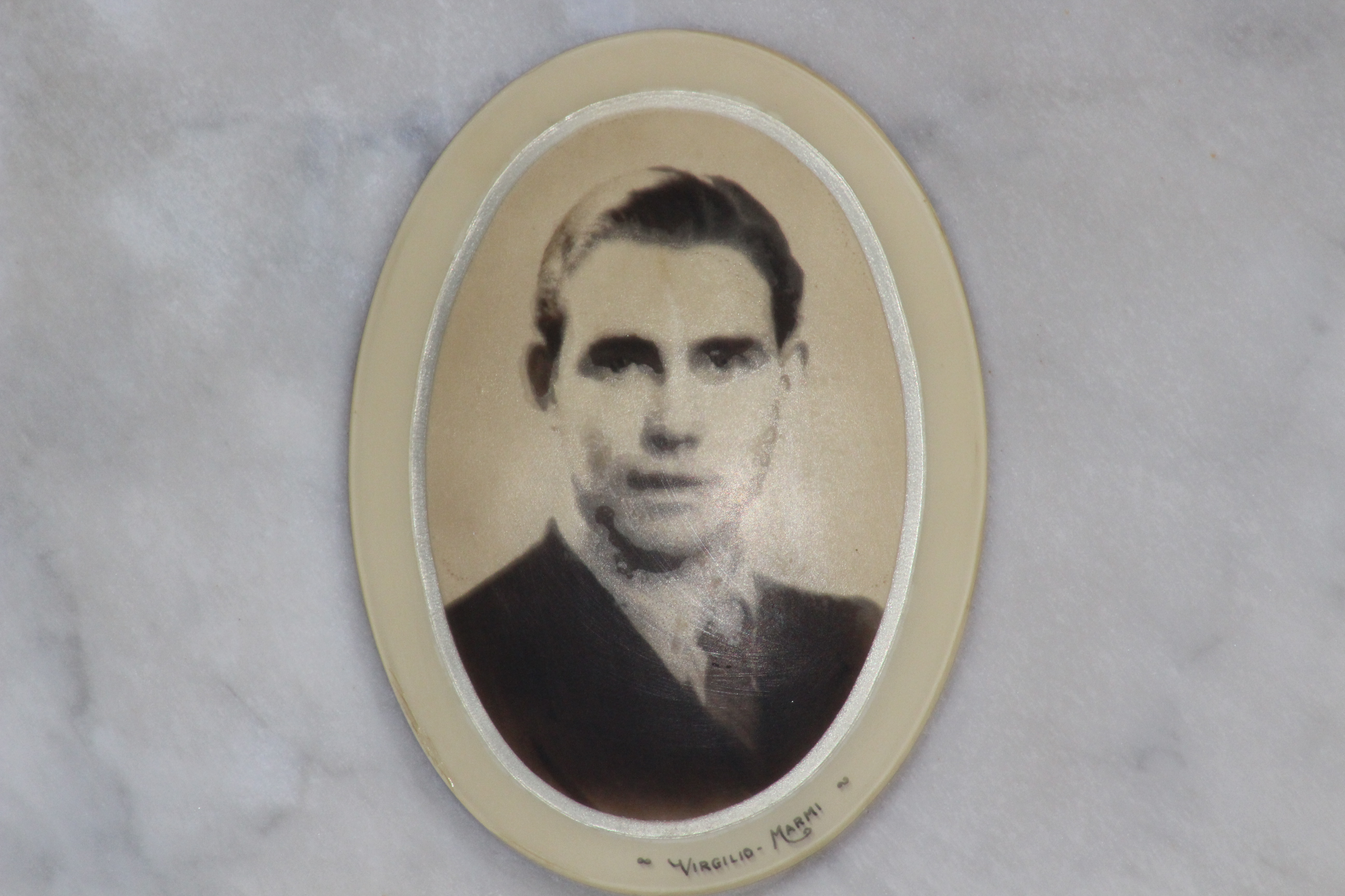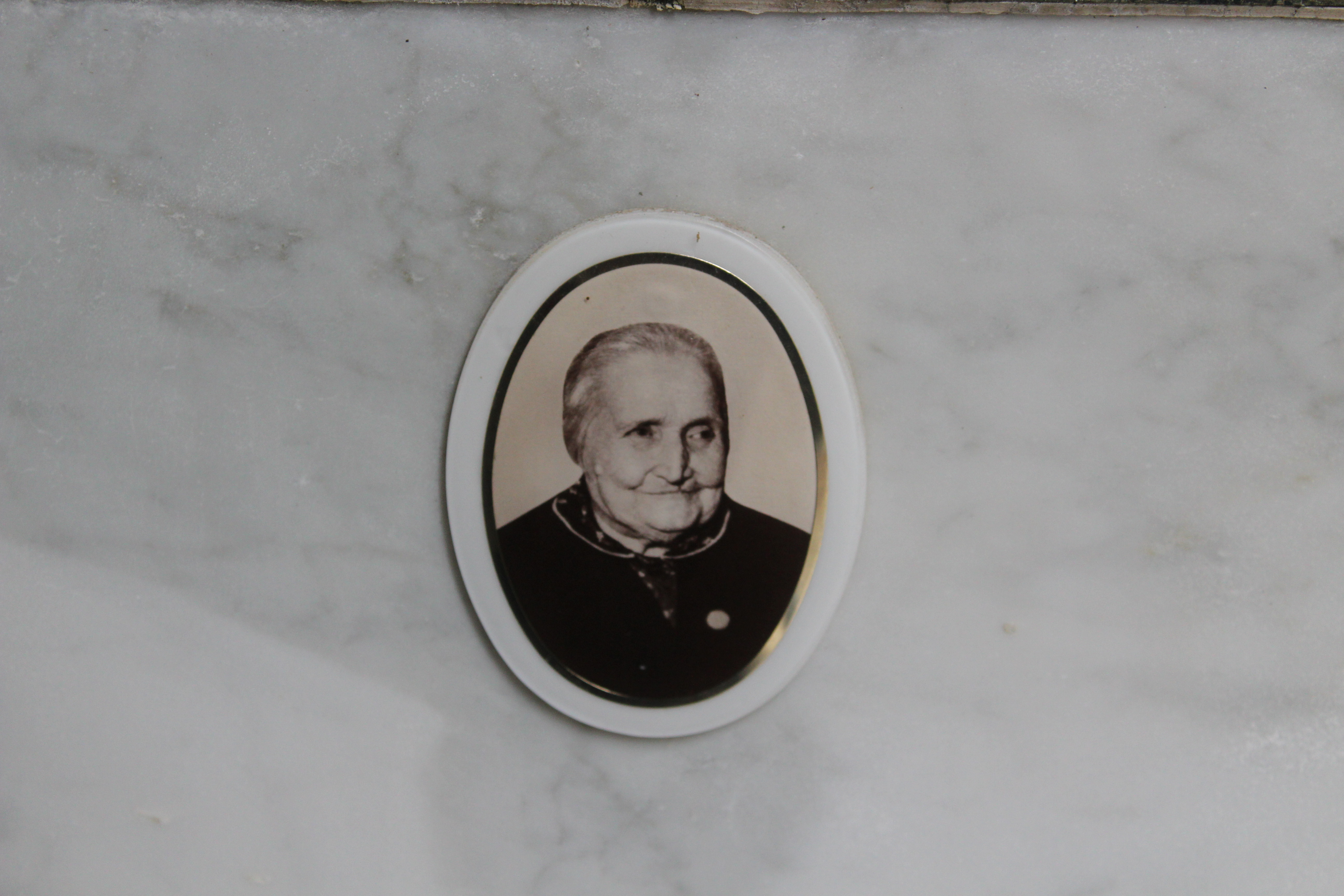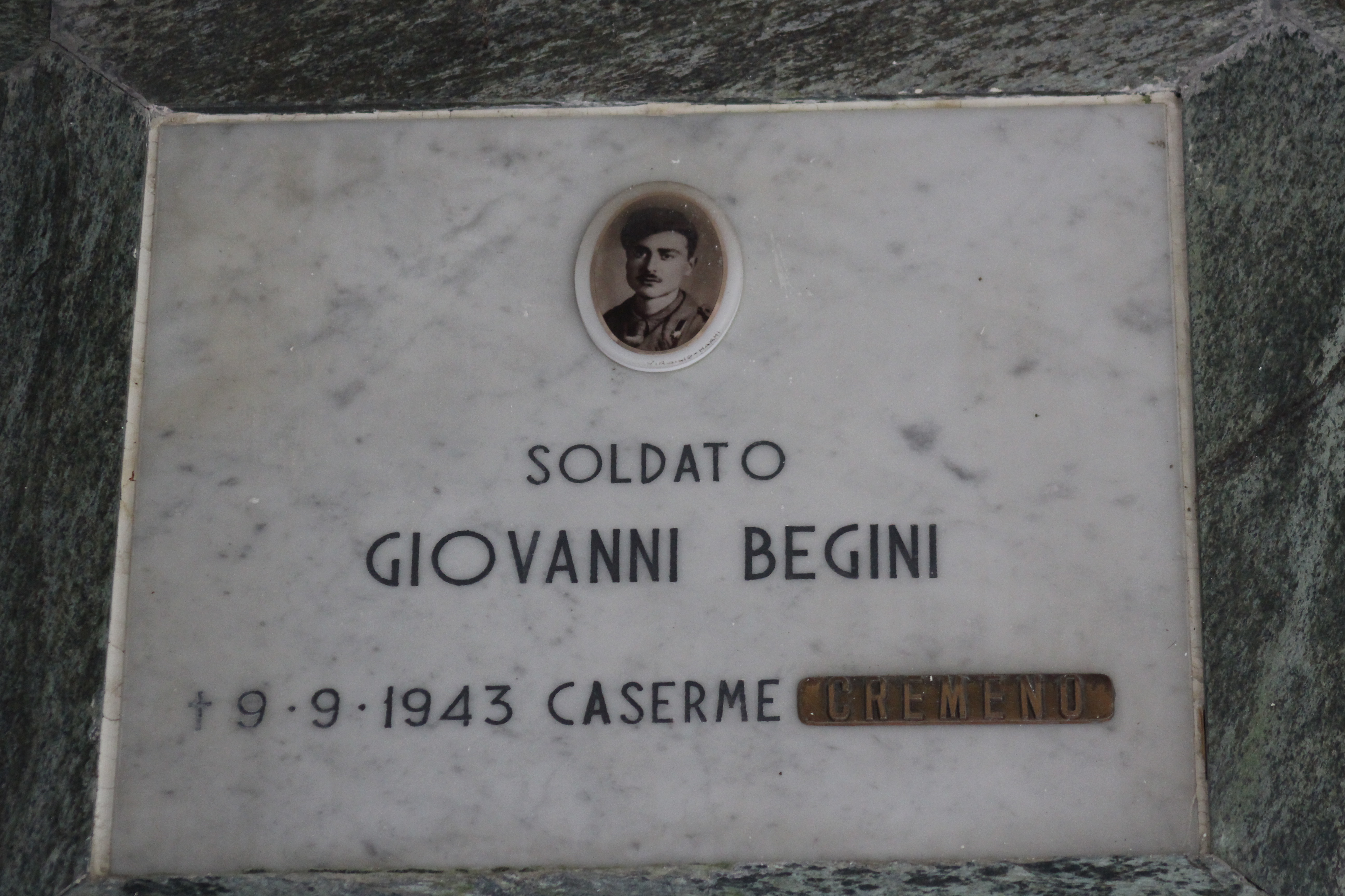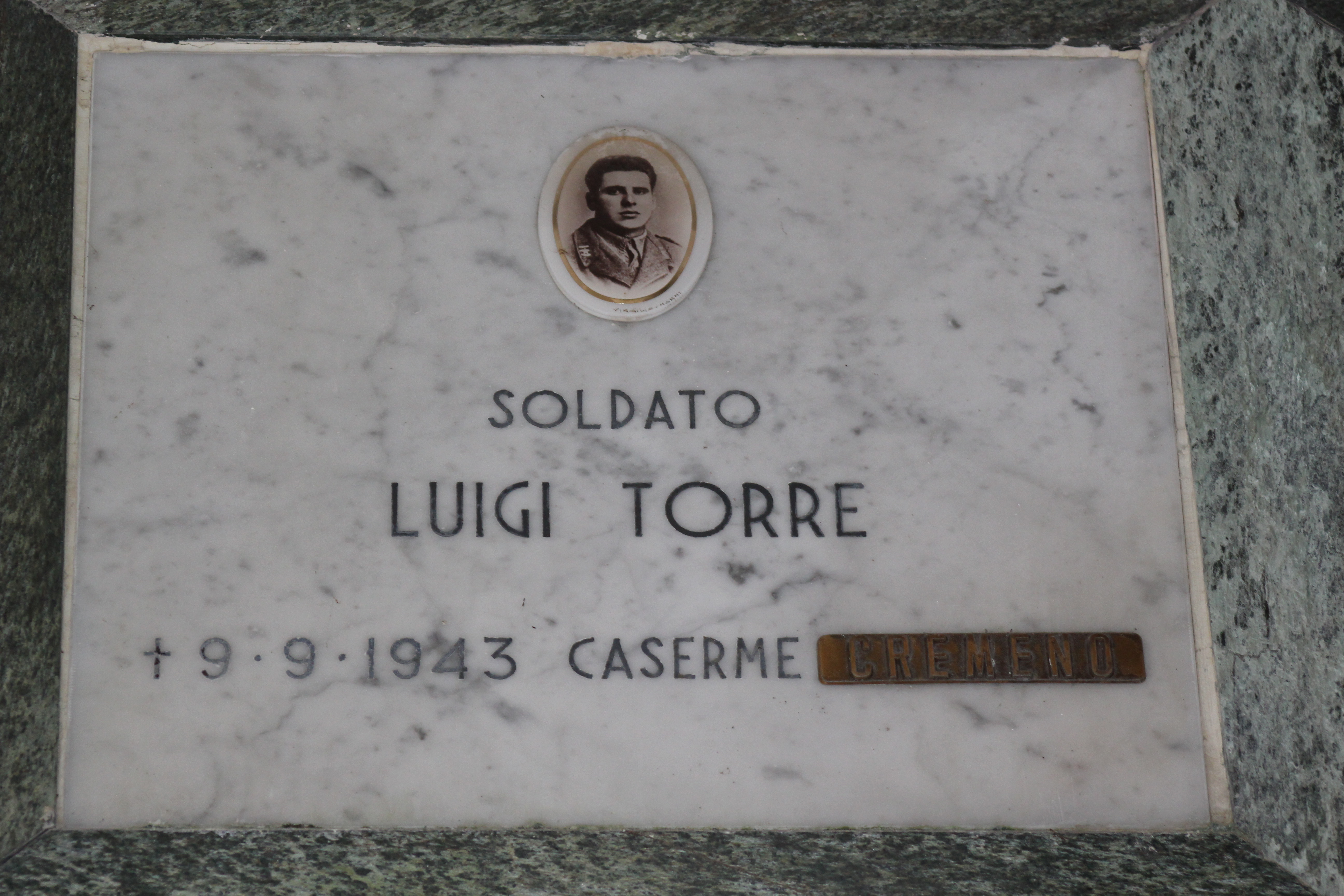Struttura commemorativa a portico in pietra e cemento, di colore grigio, con trabeazione orizzontale e pilastri squadrati che incorniciano una parete di nicchie rivestite da lastre marmoree chiare. Sulla trabeazione corre un’iscrizione in rilievo. Al centro, su un basamento, una piccola statua in bronzo. Le lapidi presentano testi incisi e piccoli ritratti ovali. Collocato in ambito cimiteriale tra alberi alti.
