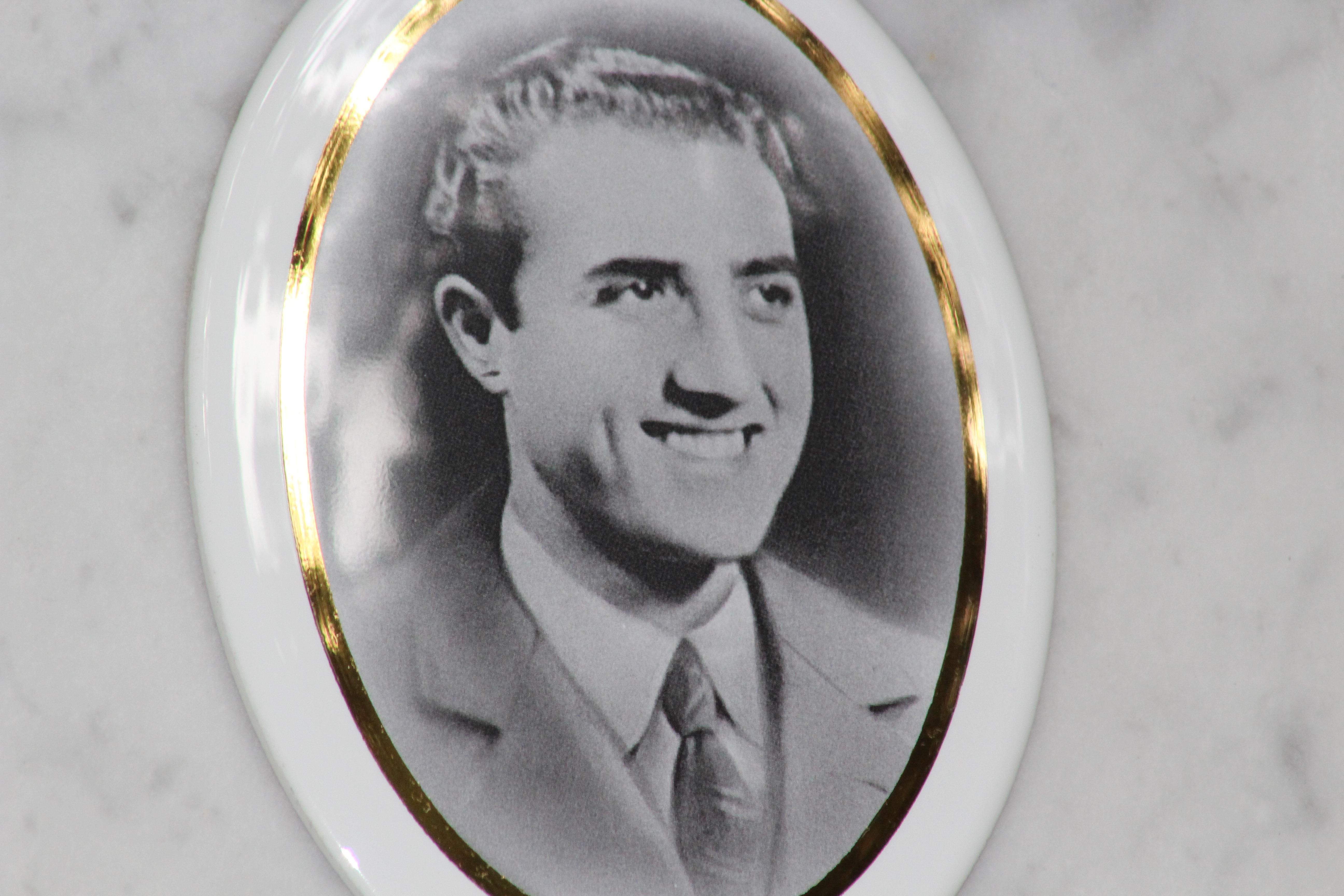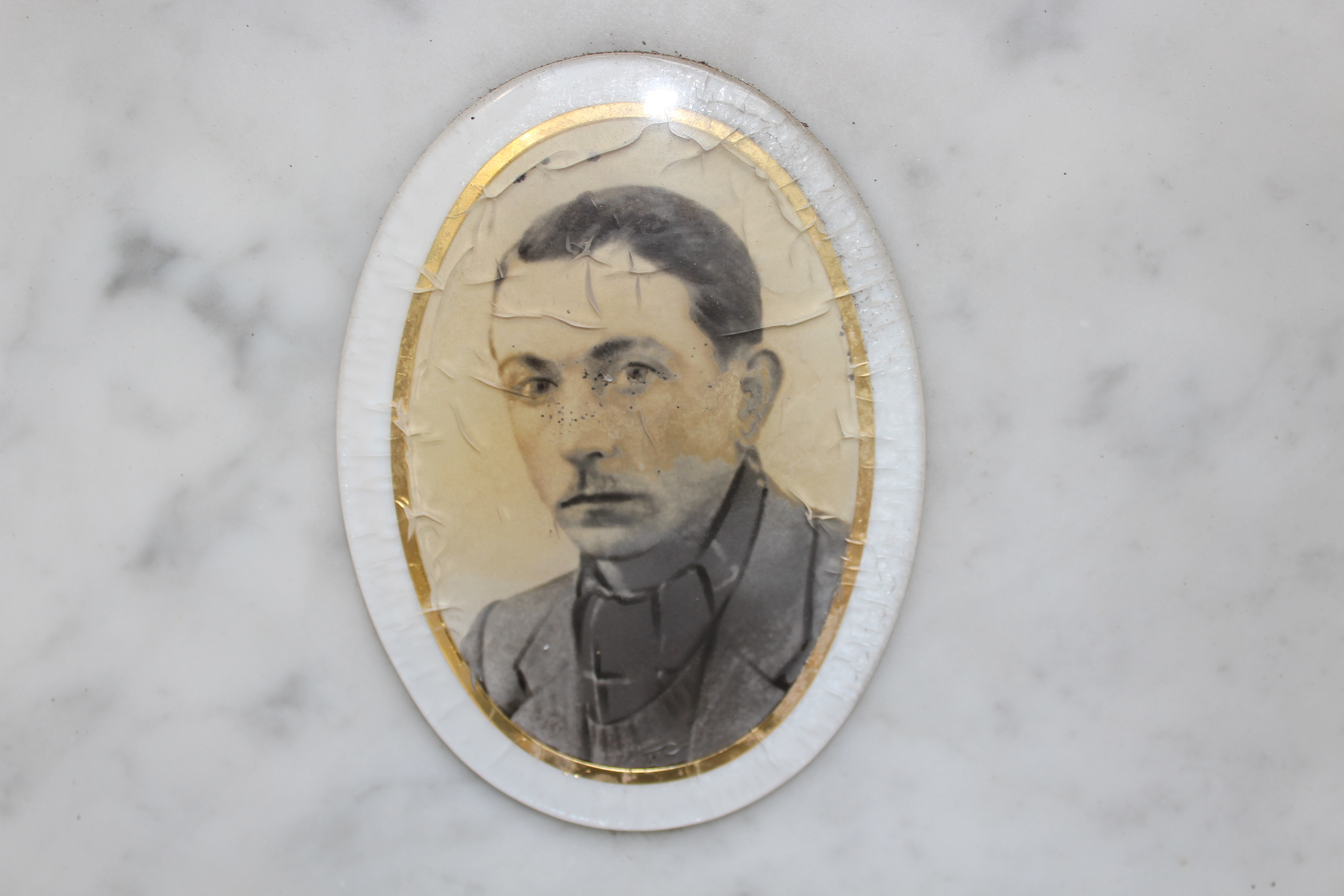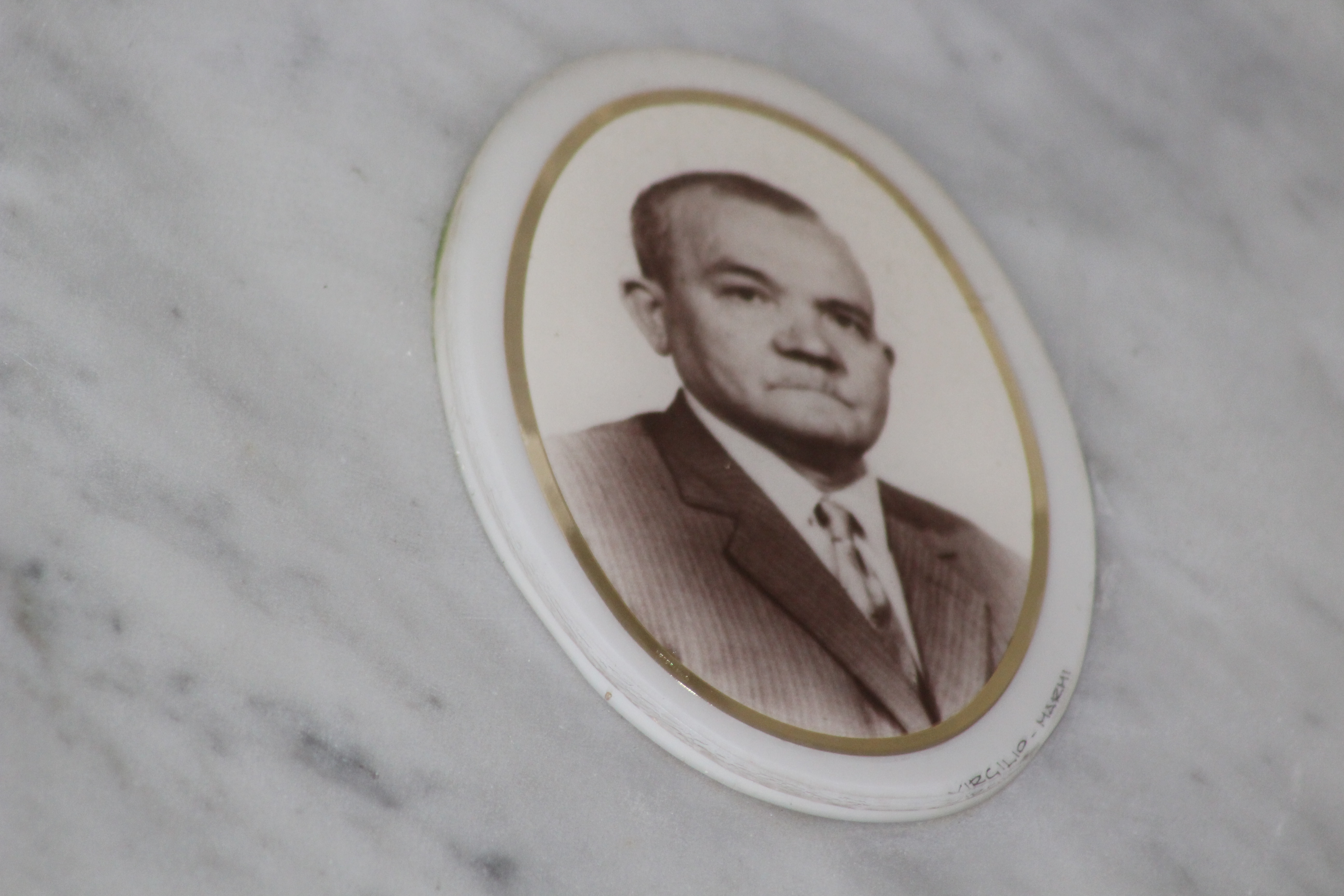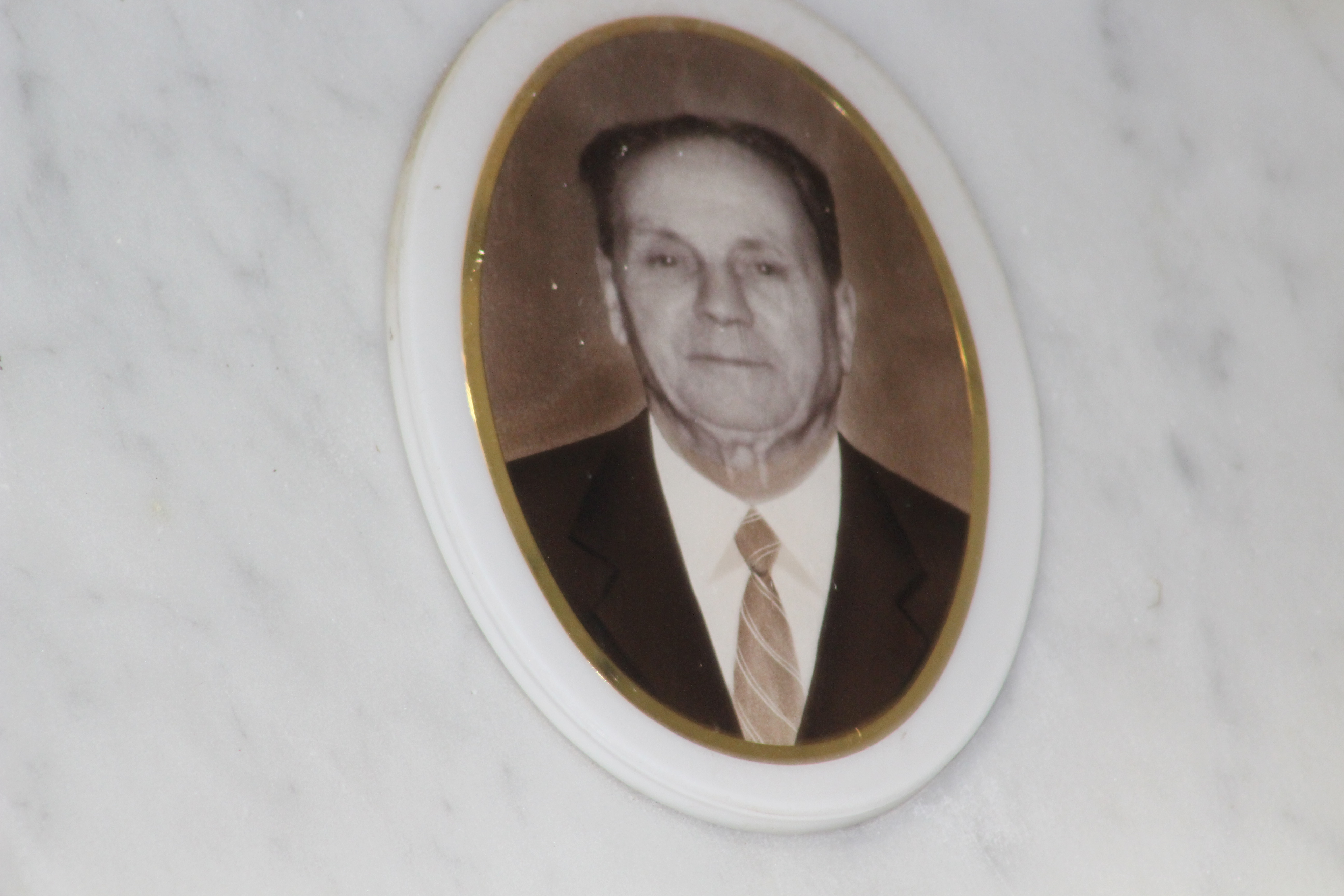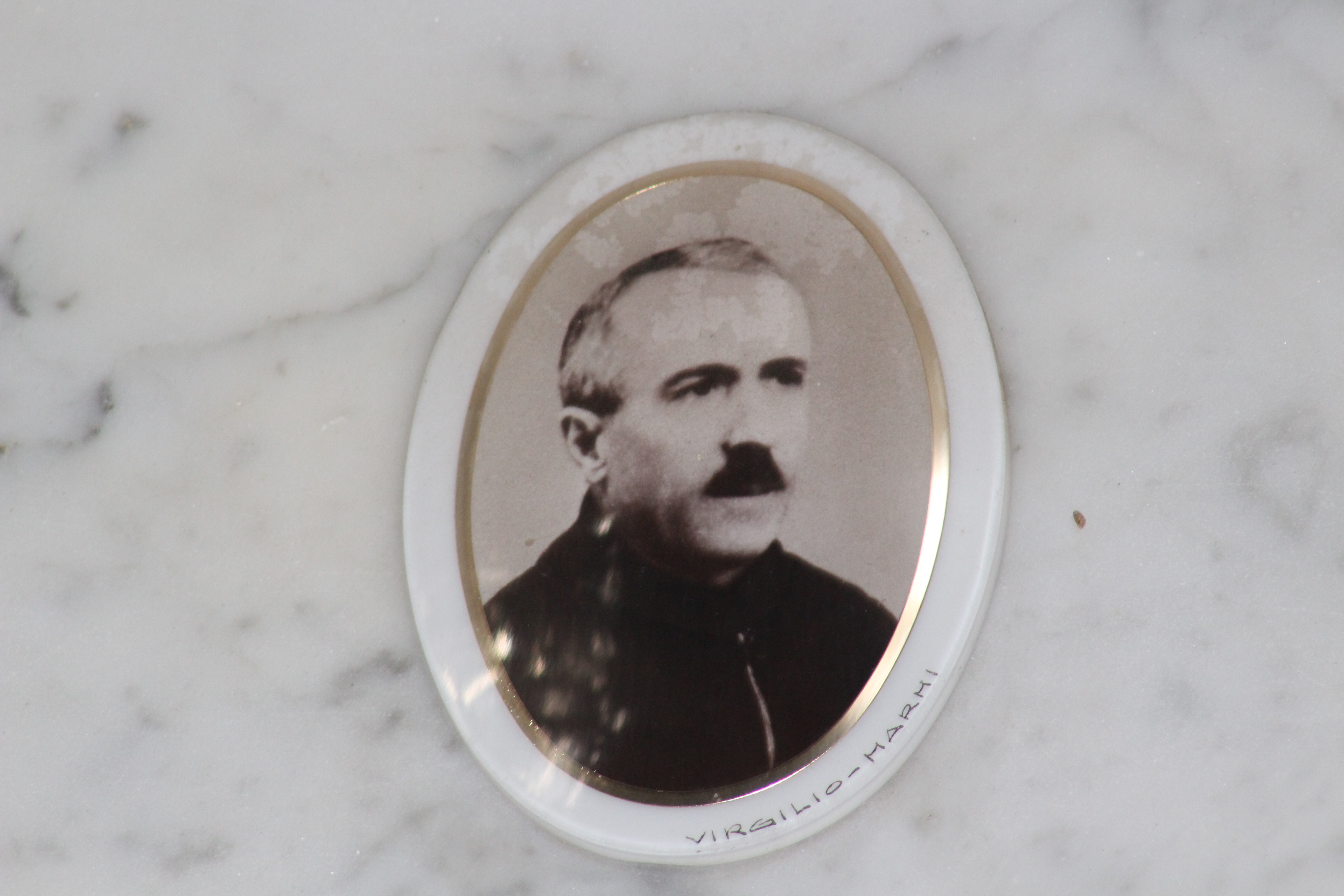 Struttura commemorativa a portico in pietra e cemento, di colore grigio, con trabeazione orizzontale e pilastri squadrati che incorniciano una parete di nicchie rivestite da lastre marmoree chiare. Sulla trabeazione corre un’iscrizione in rilievo. Al centro, su un basamento, una piccola statua in bronzo. Le lapidi presentano testi incisi e piccoli ritratti ovali. Collocato in ambito cimiteriale tra alberi alti.