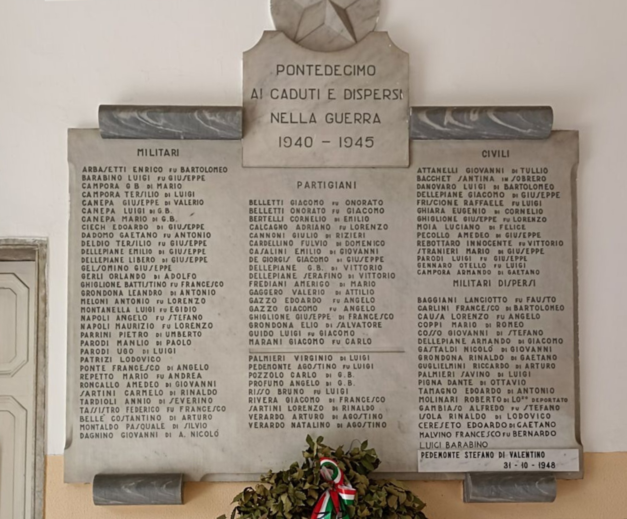 Lastra commemorativa in marmo chiaro, fissata a una parete intonacata, con sommità sagomata e due elementi laterali simili a lesene con piccoli coronamenti scuri. Al centro, un’iscrizione principale in caratteri maiuscoli sovrasta un ampio elenco di nomi incisi, organizzati per sezioni e distribuiti in più colonne. Le lettere appaiono scurite per maggiore leggibilità.