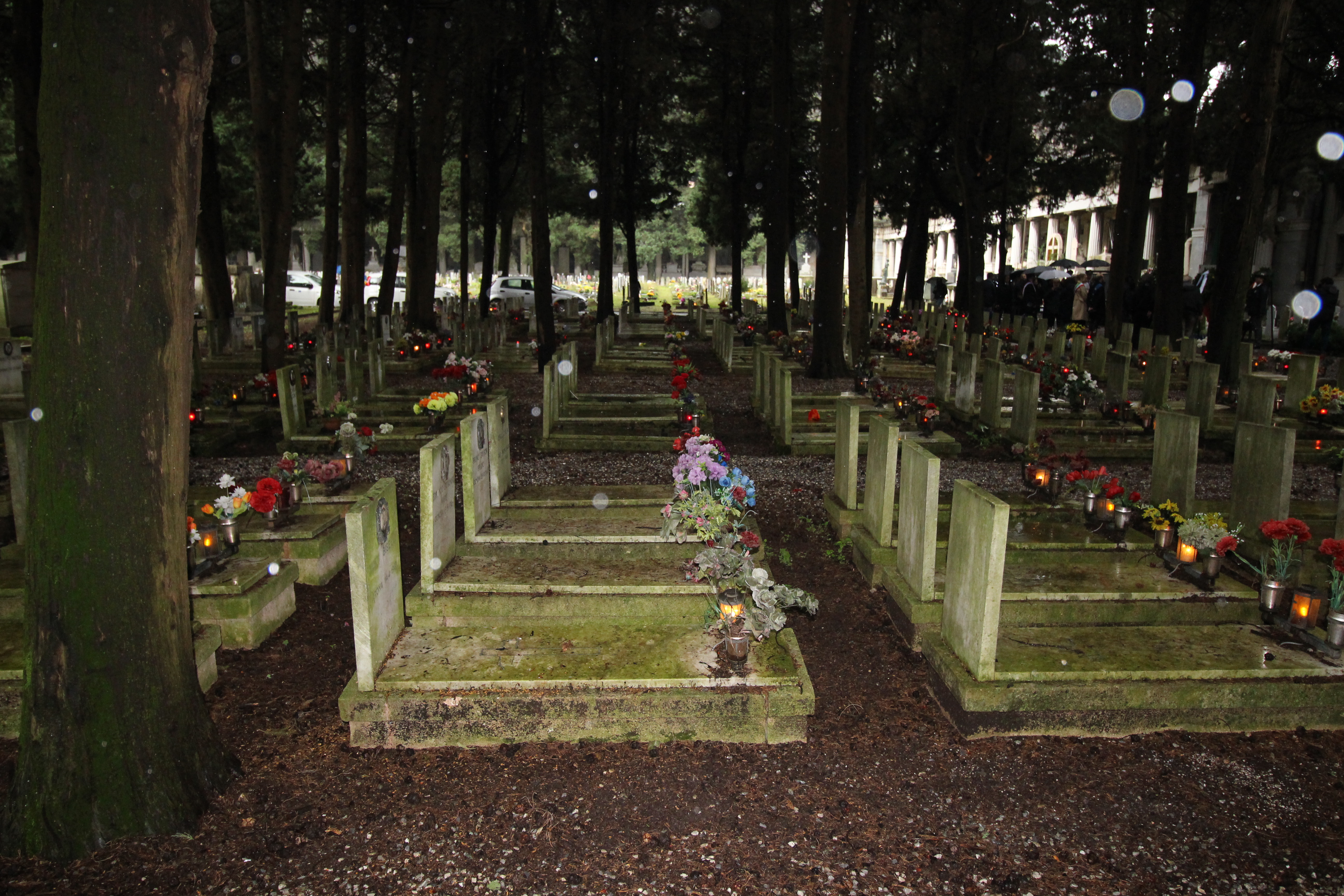 Complesso sepolcrale allineato in fitte file di lapidi e lastre rettangolari in pietra chiara, patinate dal tempo. Ogni sepoltura presenta una stele verticale con medaglione e iscrizioni. Tra gli alberi ad alto fusto spicca una targa commemorativa su supporto.