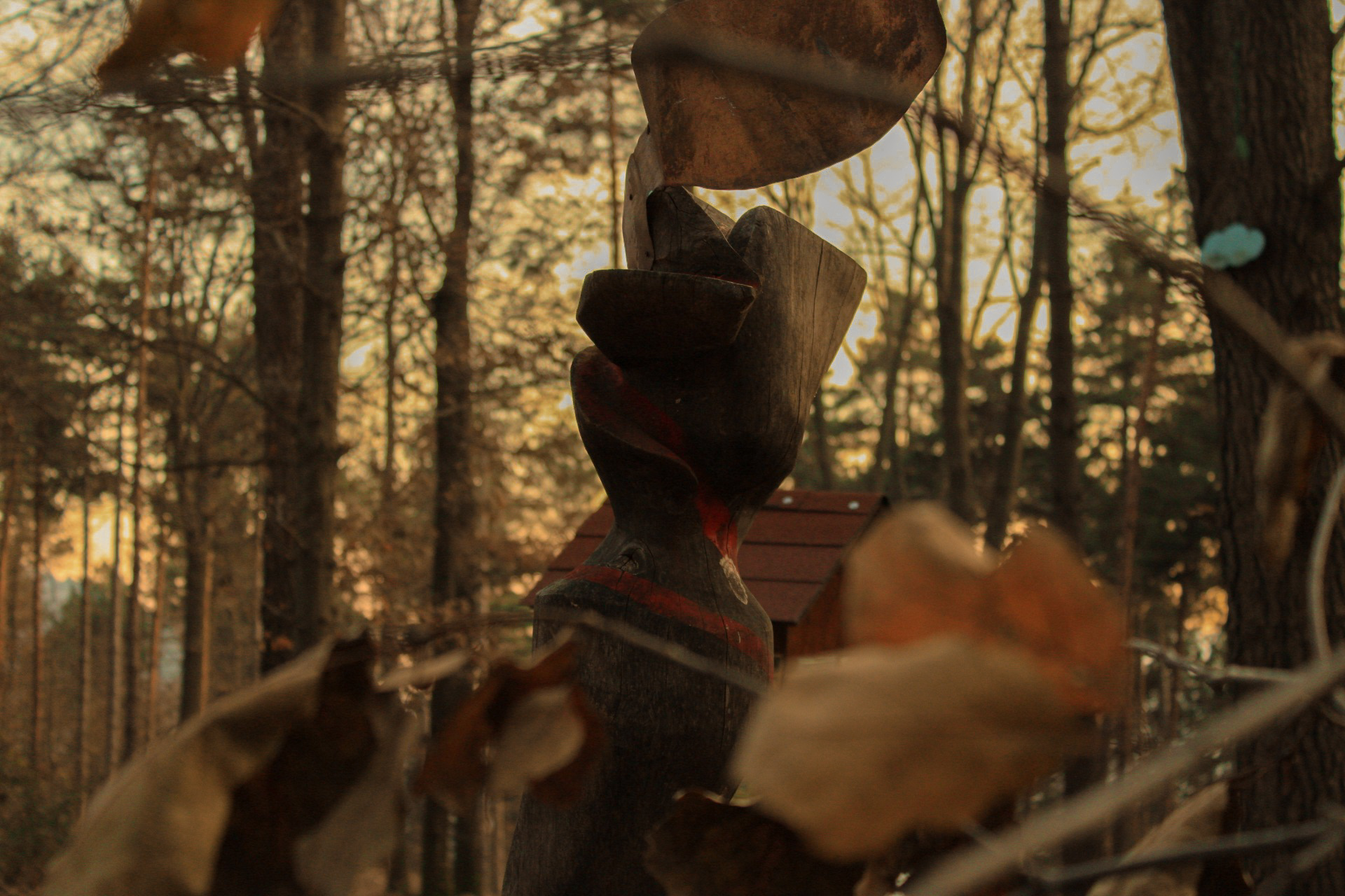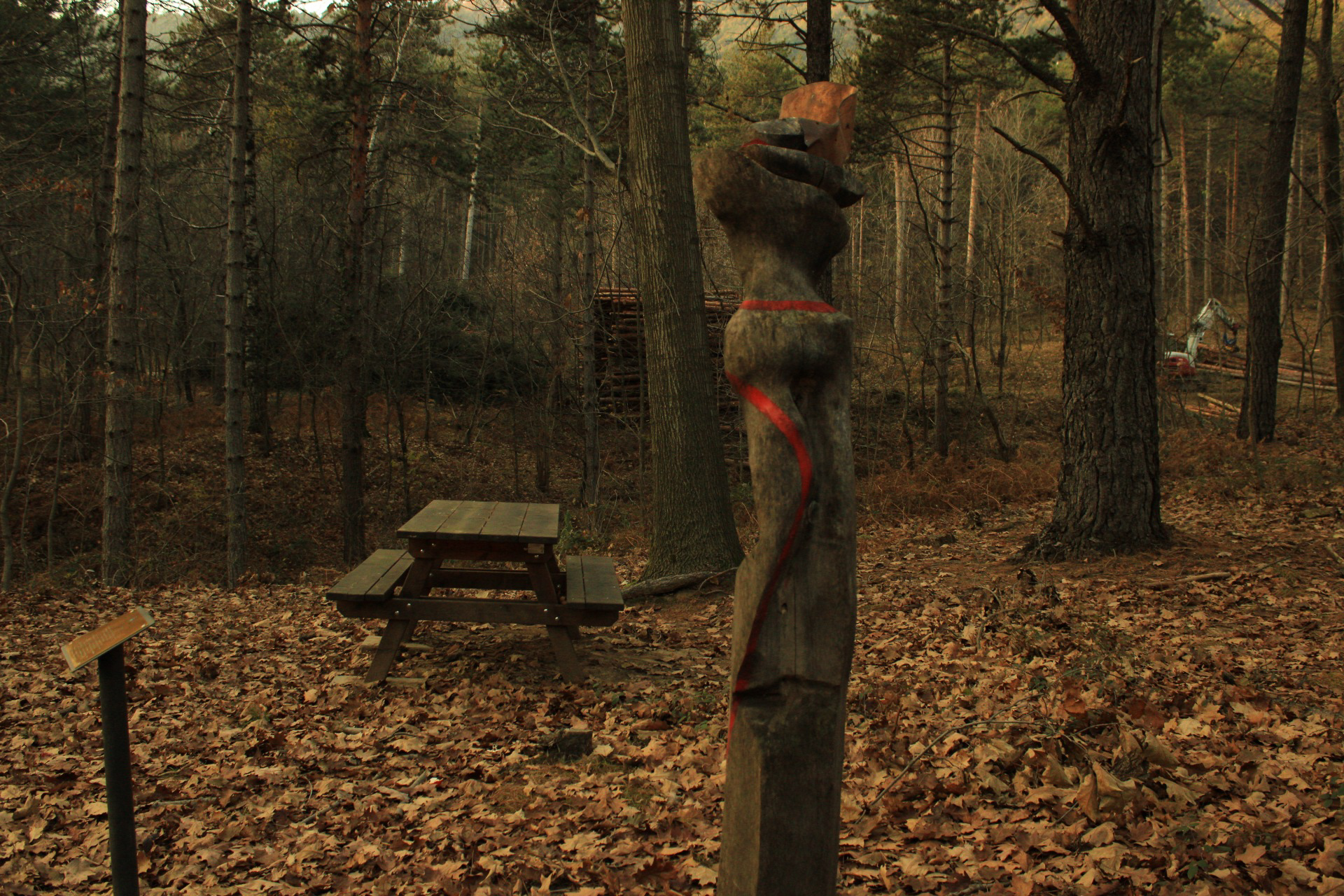 Opera composta da un elemento verticale in legno scolpito, scuro e venato, dalla sagoma sinuosa con una fessura in sommità che accoglie una lamina metallica piegata di colore ramato. Una striscia rossa dipinta percorre il tronco in diagonale. La base è fissata con staffe su un supporto ligneo. Si trova in un’area boschiva, vicino a una targa con iscrizione.