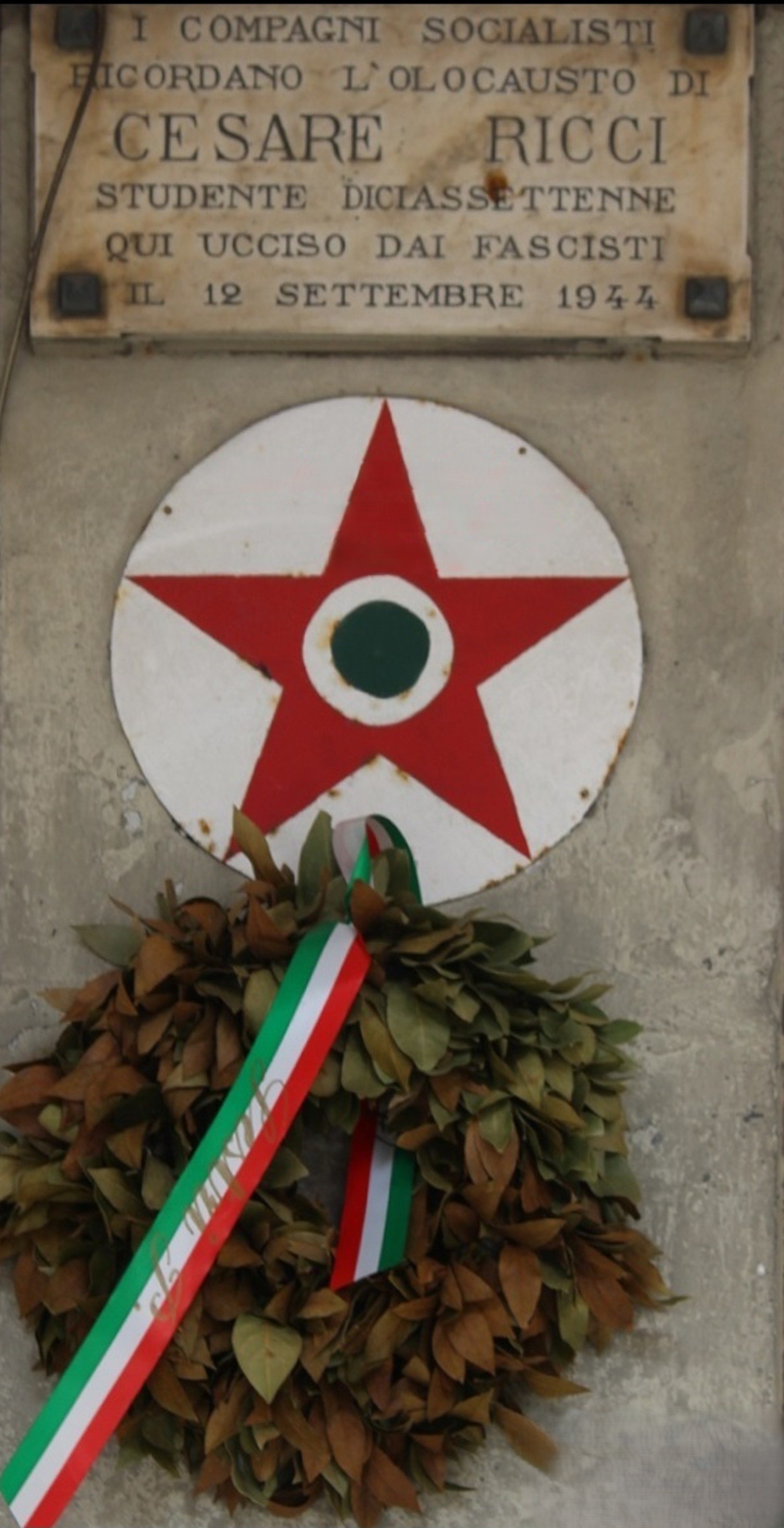 Targa composta da una lastra rettangolare in pietra fissata a una parete intonacata, con iscrizione incisa e lettere scure, bloccata da borchie agli angoli. Sotto, un disco circolare dipinto con grande stella rossa a cinque punte e piccolo cerchio verde centrale su fondo bianco.