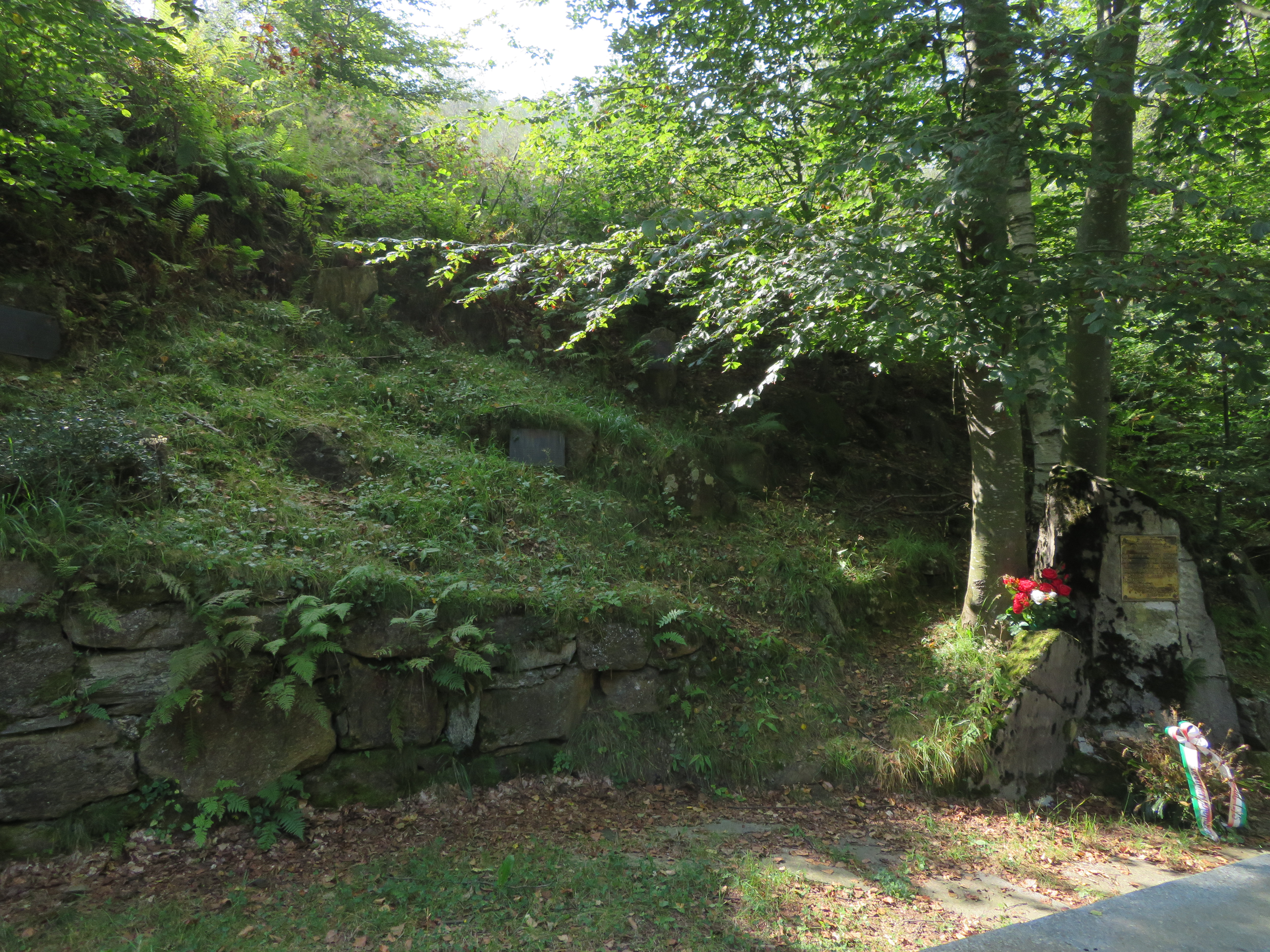 Complesso commemorativo in ambiente boschivo: una serie di lastre metalliche scure, con titoli in rosso, stemmi e incisioni, fissate a massi e a un muretto di pietre ricoperte di muschio. È presente un pannello informativo su supporto ligneo e un cartello in legno con tettoia.