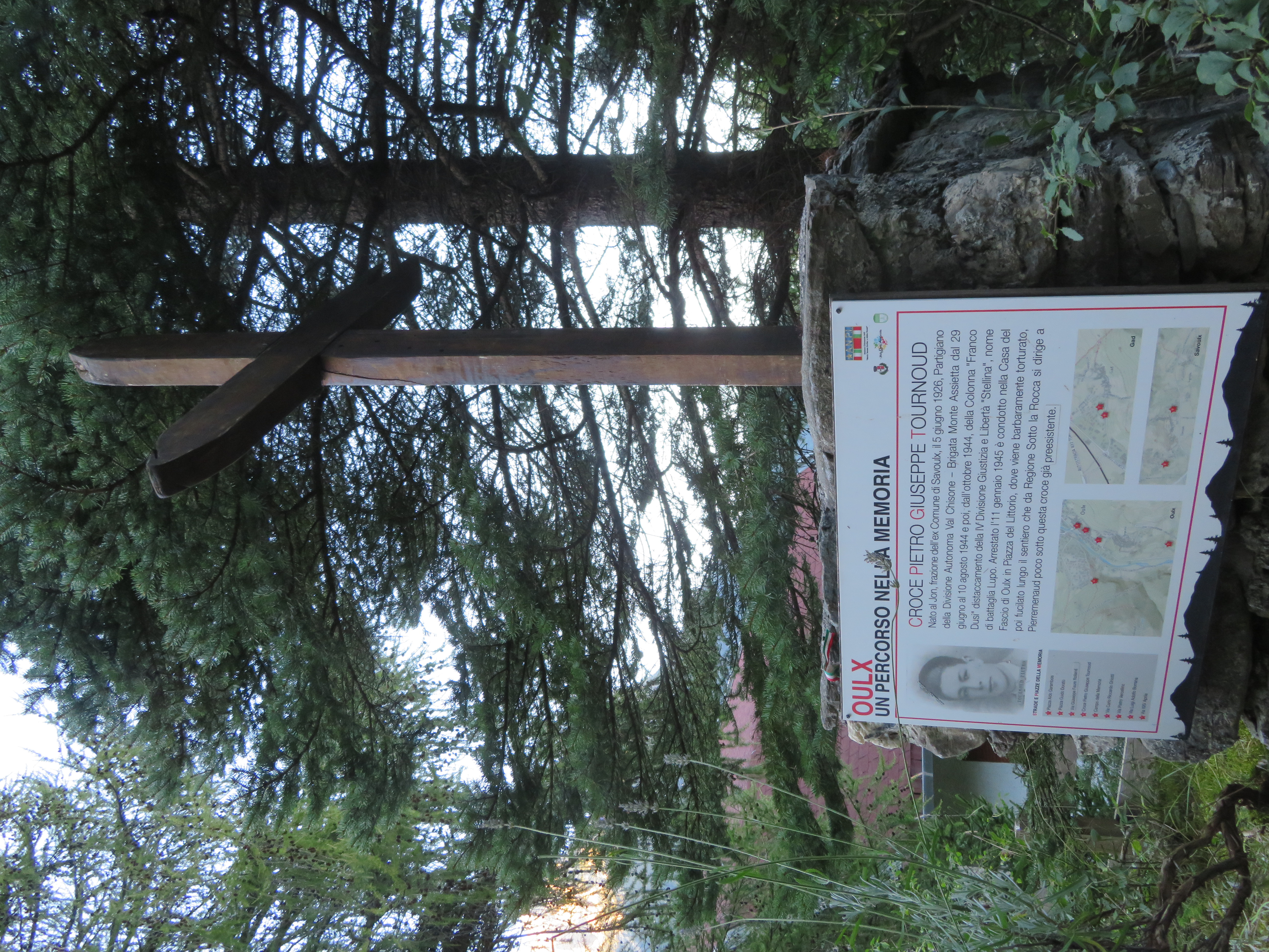 Una croce semplice in legno, con braccio orizzontale fissato al montante verticale, è posta su un basso basamento di pietre irregolari legate a malta. Sul fronte è applicato un ampio pannello informativo rigido a fondo chiaro, con testi, una fotografia in bianco e nero e mappe, oltre a piccoli loghi. L’insieme si trova in un ambiente boschivo, tra conifere e fitti arbusti, che in parte nascondono la base e il pannello.