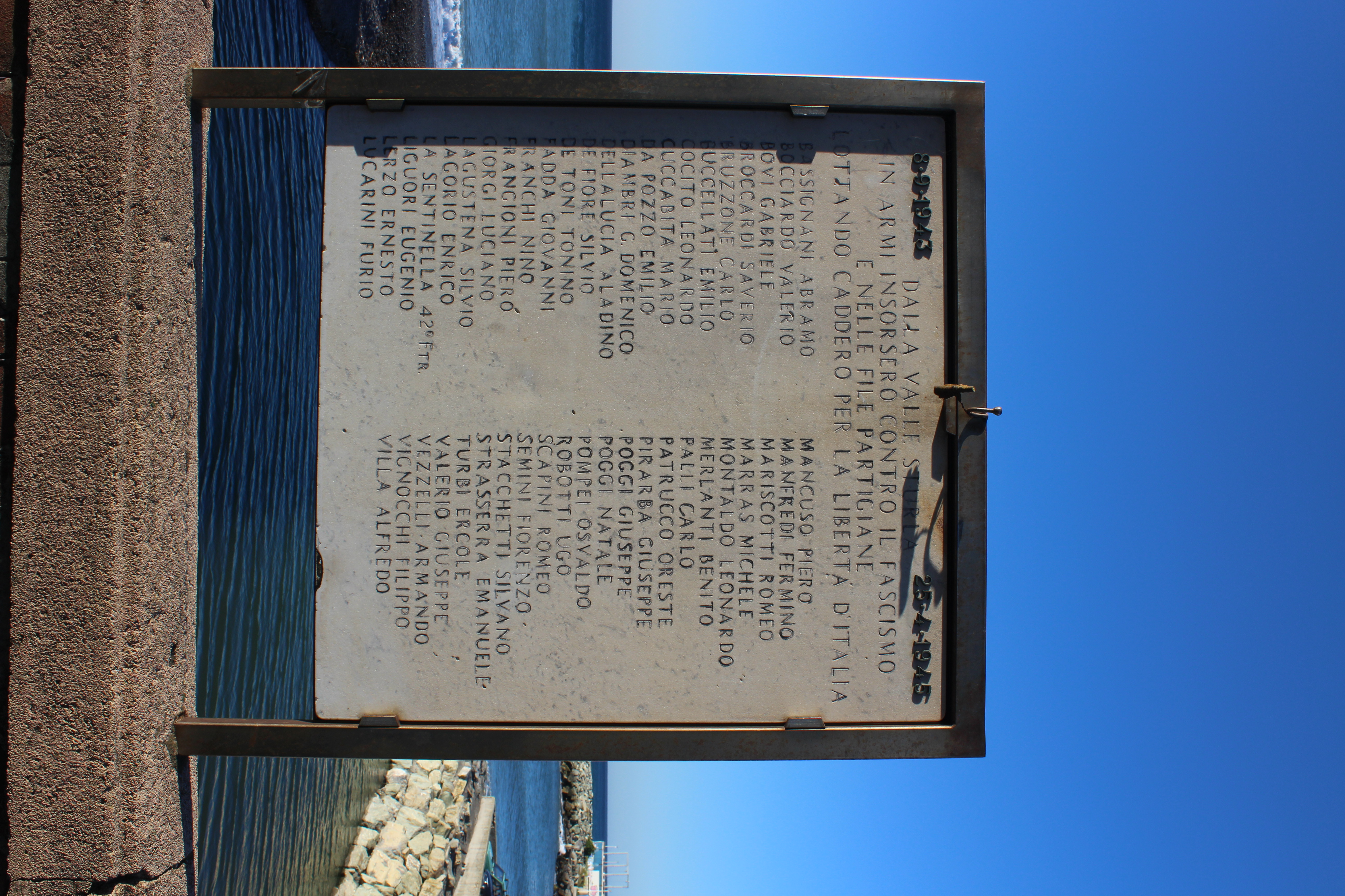 8.9.1943 - 25.4.1945 dalla valle sturla in armi insorsero contro il fascismo e nelle file partigiane lottando caddero per la libertà d'italia BASSIGNANI ABRAMO BOCCIARDO VALERIO BOVI GABRIELE BROCCARDI SAVERIO BRUZZONE CARLO BUCCELATI EMILIO COCITO LEONARDO CUCCABITA MARIO DA POZZO EMILIO DIAMBRI G. DOMENICO DELLALUCIA ALADINO DE FIORE SILVIO DE TONI TONINO FADDA GIOVANNI FRANCHI NINO FRANGIONI PIERO GIORGI LUCIANO LAGUSTENA SILVIO LAGORIO ENRICO LA SENTINELLA 42° F.T.R. LIGUORI EUGENIO LERZO ERNESTO LUCARINI FURIO MANCUSO PIERO MANFREDI FERMINO MARISCOTTI ROMEO MARRAS MICHELE MONTALDO DOMENICO MERLANTI BENITO PALLI CARLO PATRUCCO ORESTE PIRARBA GIUSEPPE POGGI GIUSEPPE POGGI NATALE POMPEI OSVALDO ROBOTTI UGO SCAPINI ROMEO SEMINI FIORENZO STACCHETTI SILVANO STRASSERRA EMANUELE TURBI ERCOLE VALERIO GIUSEPPE VEZZELLI ARMANDO VIGNOCCHI FILIPPO VILLA ALFREDO