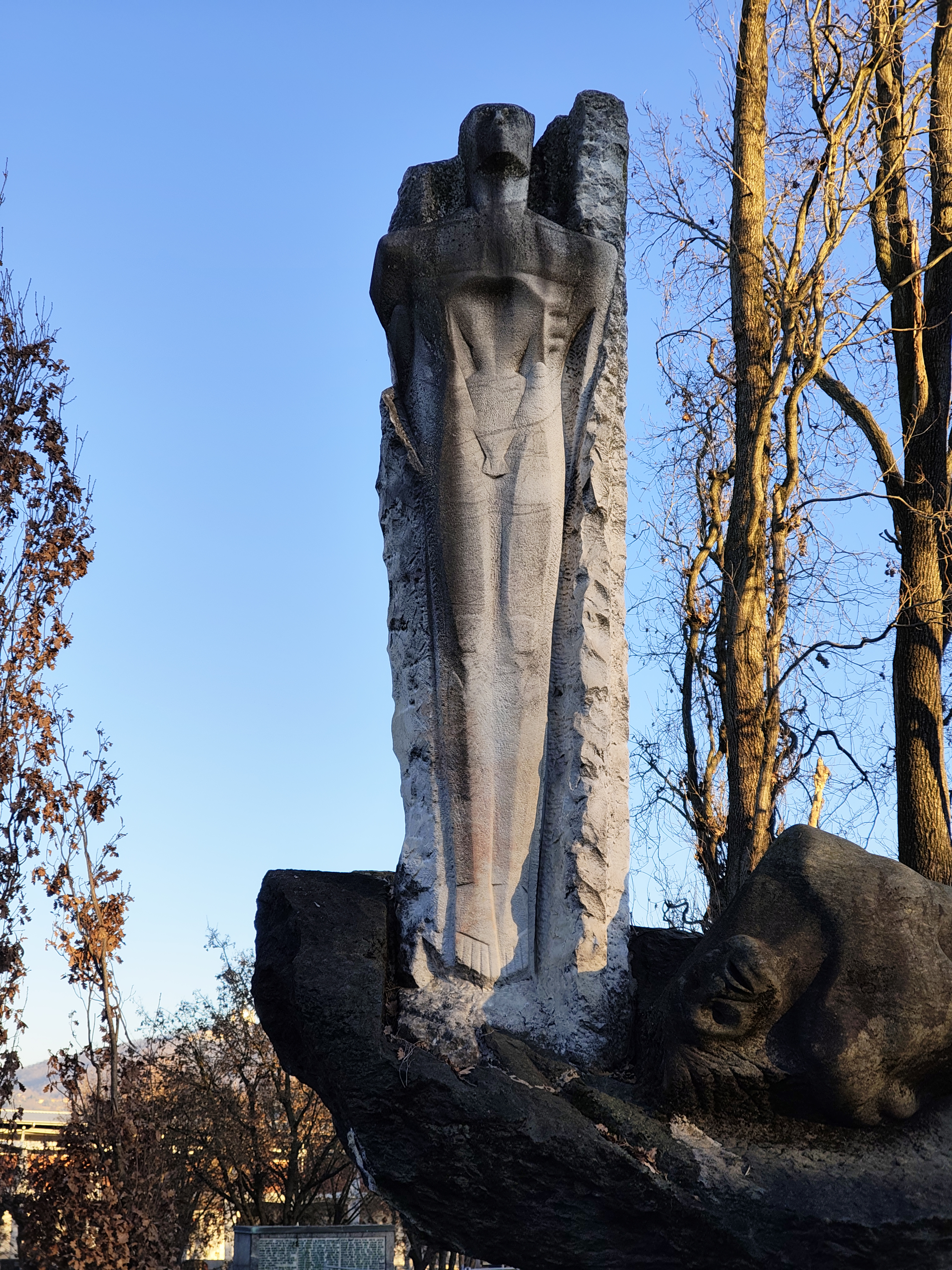 Scultura in pietra composta da un elemento verticale con figura umana stilizzata scolpita in rilievo su un monolite chiaro, affiancato da un grande blocco scuro che sporge in orizzontale e sostiene un corpo disteso. L’insieme poggia su un pilastro centrale, con superfici alternatamente levigate e grezze. Il complesso è racchiuso da un basso recinto in pietra, su prato cosparso di foglie, con intorno piccoli massi con targhette metalliche e fiori. Presente anche un pannello informativo vicino al bordo dell’area.