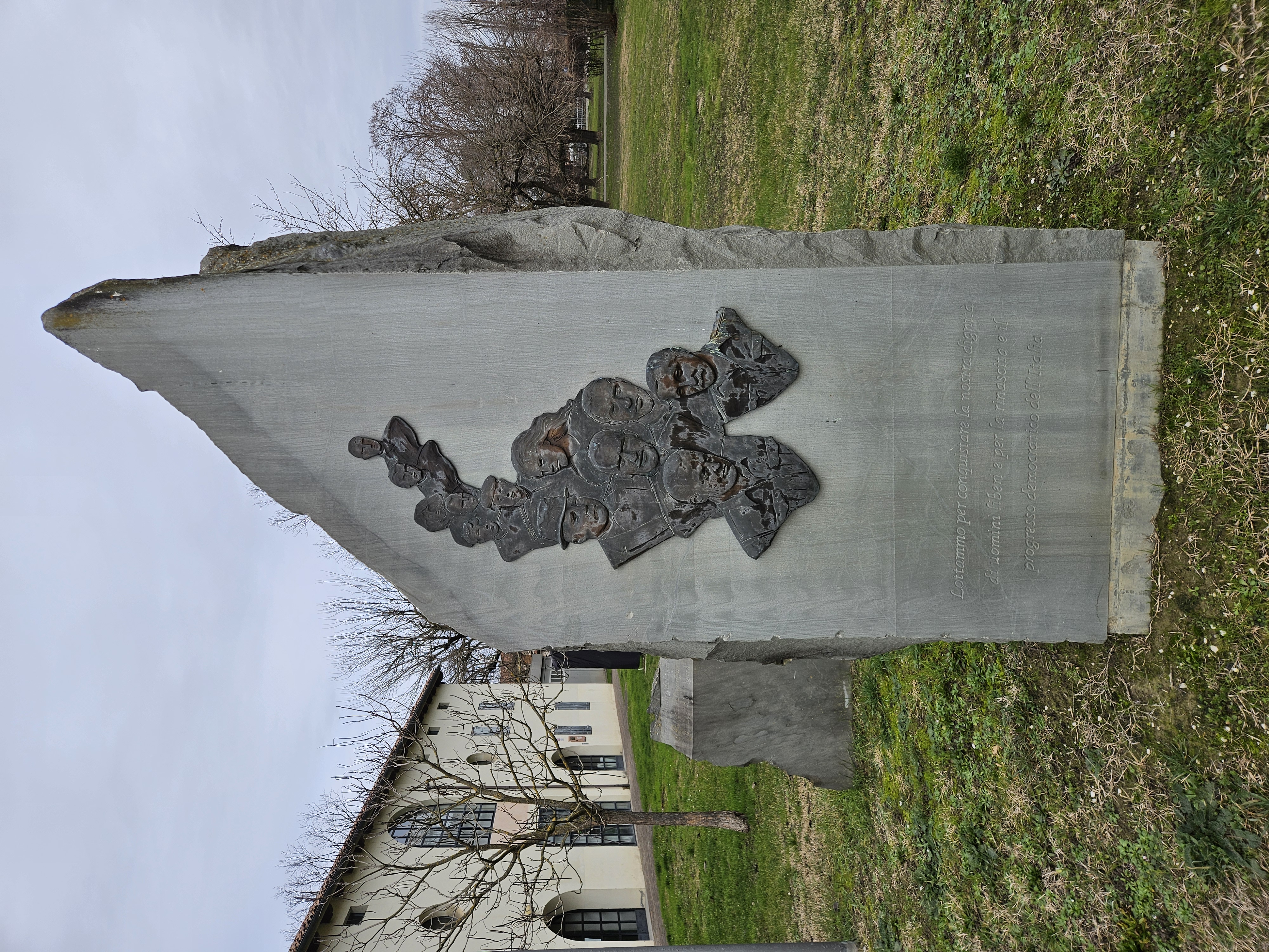 Composizione scultorea in pietra grigia composta da una stele alta, irregolare e appuntita, con fronte levigato e lati scabri. Sulla faccia principale è applicato un rilievo in bronzo scuro con una sequenza verticale di volti, mentre nella parte inferiore compaiono iscrizioni incise. Accanto, un blocco più basso, grezzo, reca anch’esso scritte incise.