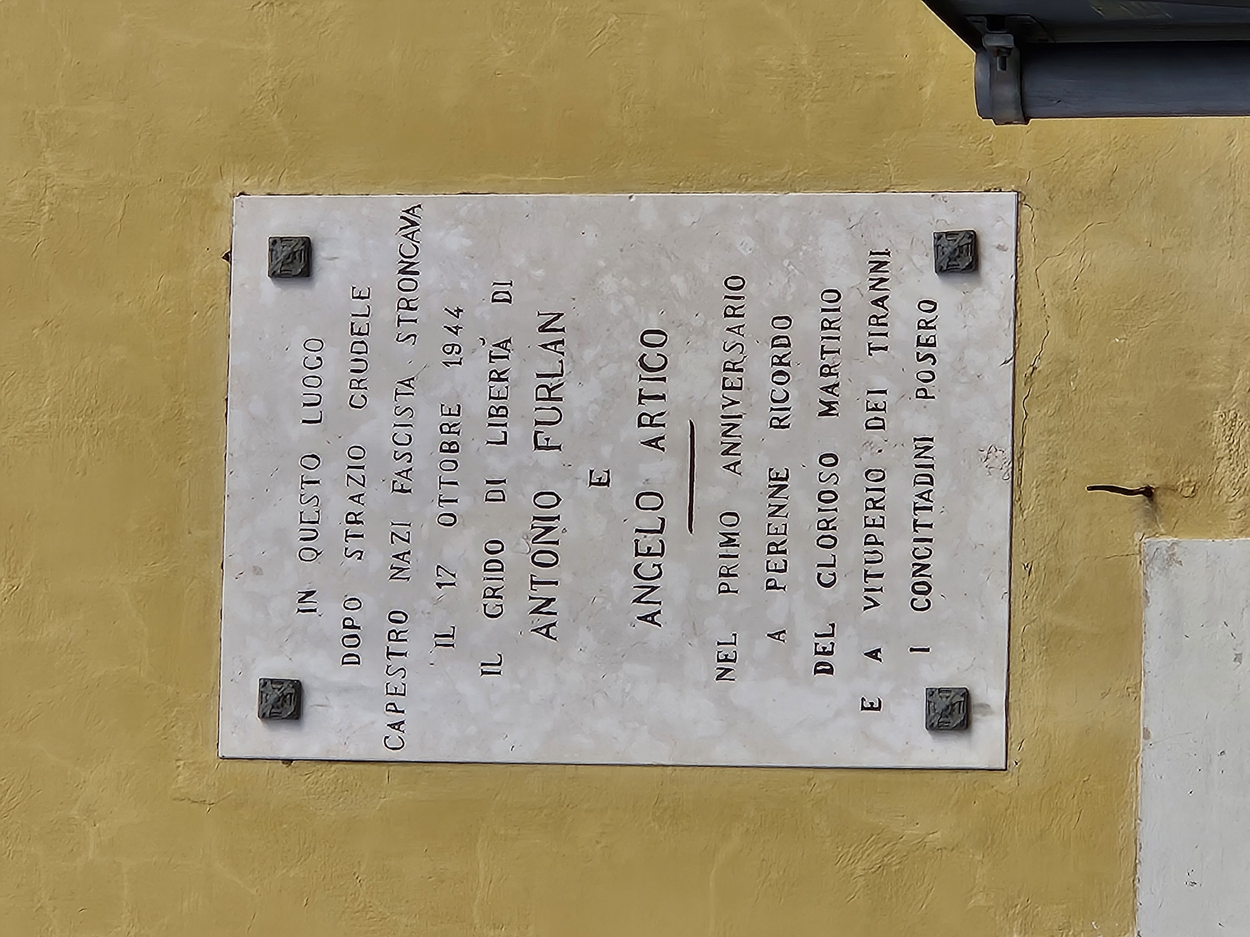 in questo luogo dopo strazio crudele capestro nazi fascista stroncava il 17 ottobre 1944 il grido di libertà di ANTONIO FURLAN e ANGELO ARTICO --- nel primo anniversario a perenne ricordo del glorioso martirio e a vituperio dei tiranni i concittadini posero