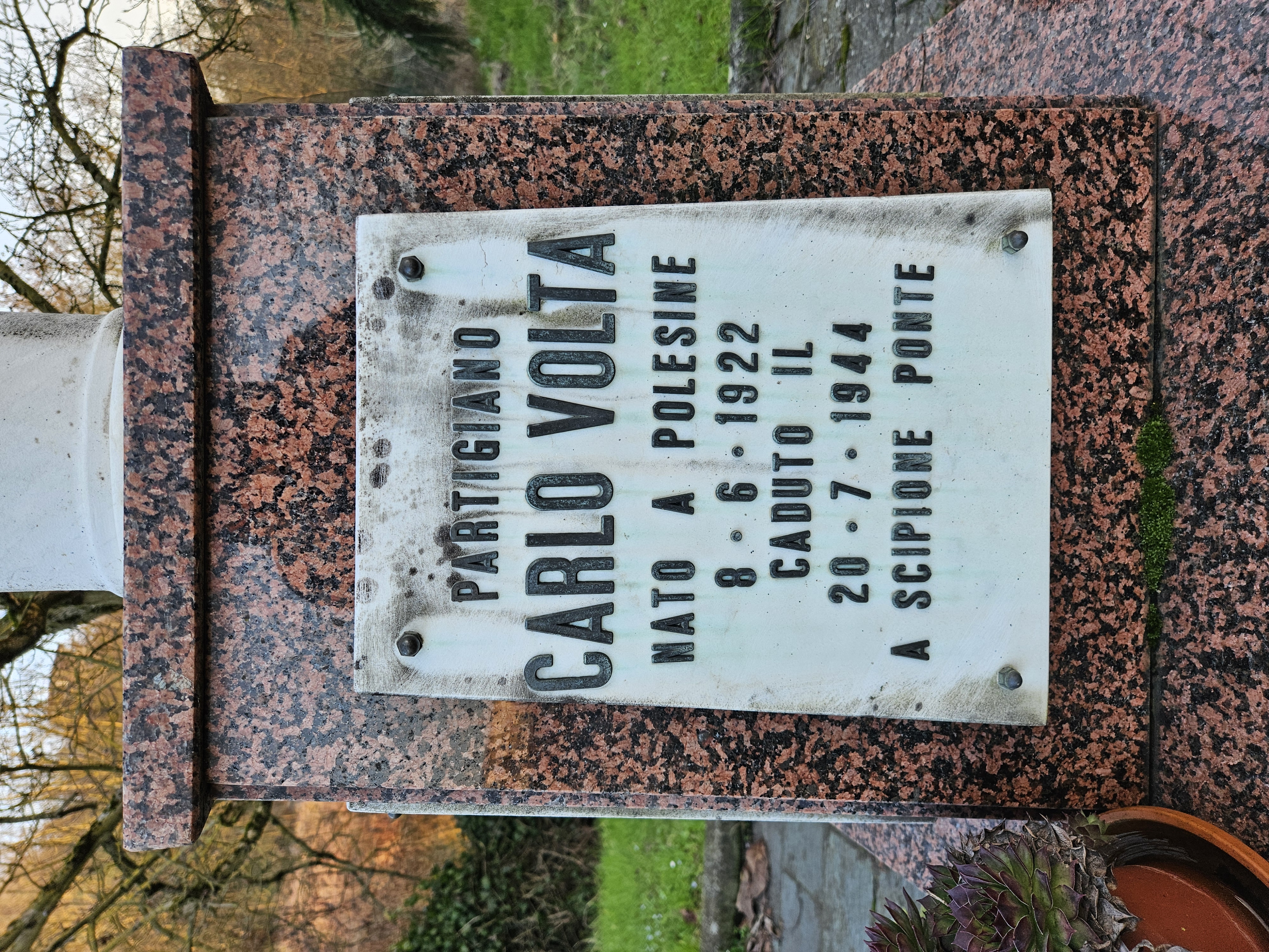 partigiano CARLO VOLTA nato a polesine 8 . 6 . 1922 caduto il 20 . 7 . 1944 a scipione ponte