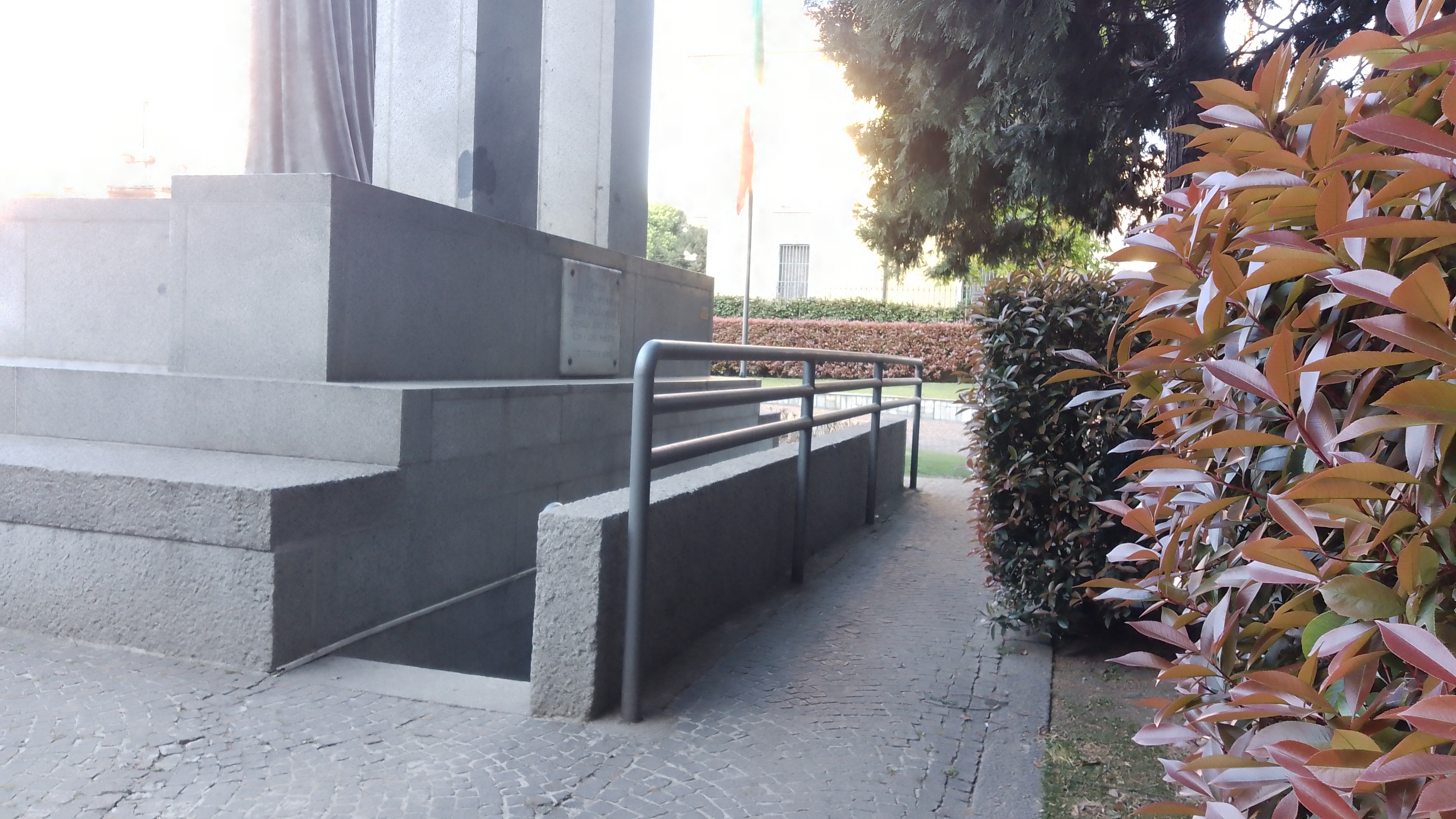 Composizione monumentale su ampio basamento in pietra chiara con gradoni, affiancata da una rampa con corrimano metallico. Tre alti pilastri rettangolari, collegati superiormente da elementi orizzontali, incorniciano al centro una scultura in bronzo scuro di una figura velata che regge un corpo minuto. Sono presenti una piccola targa metallica sul piedistallo e un grande pannello marrone con testo bianco.
